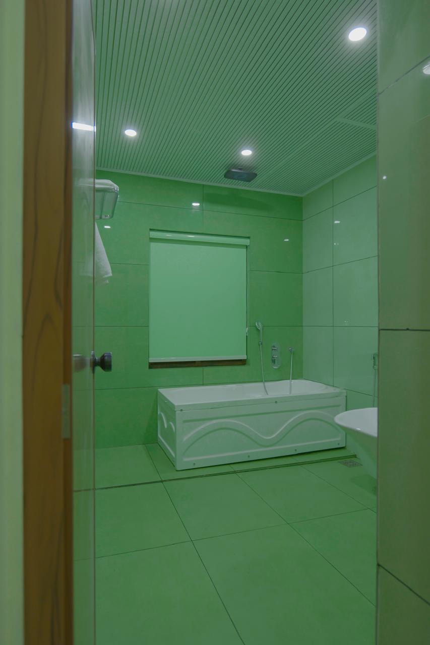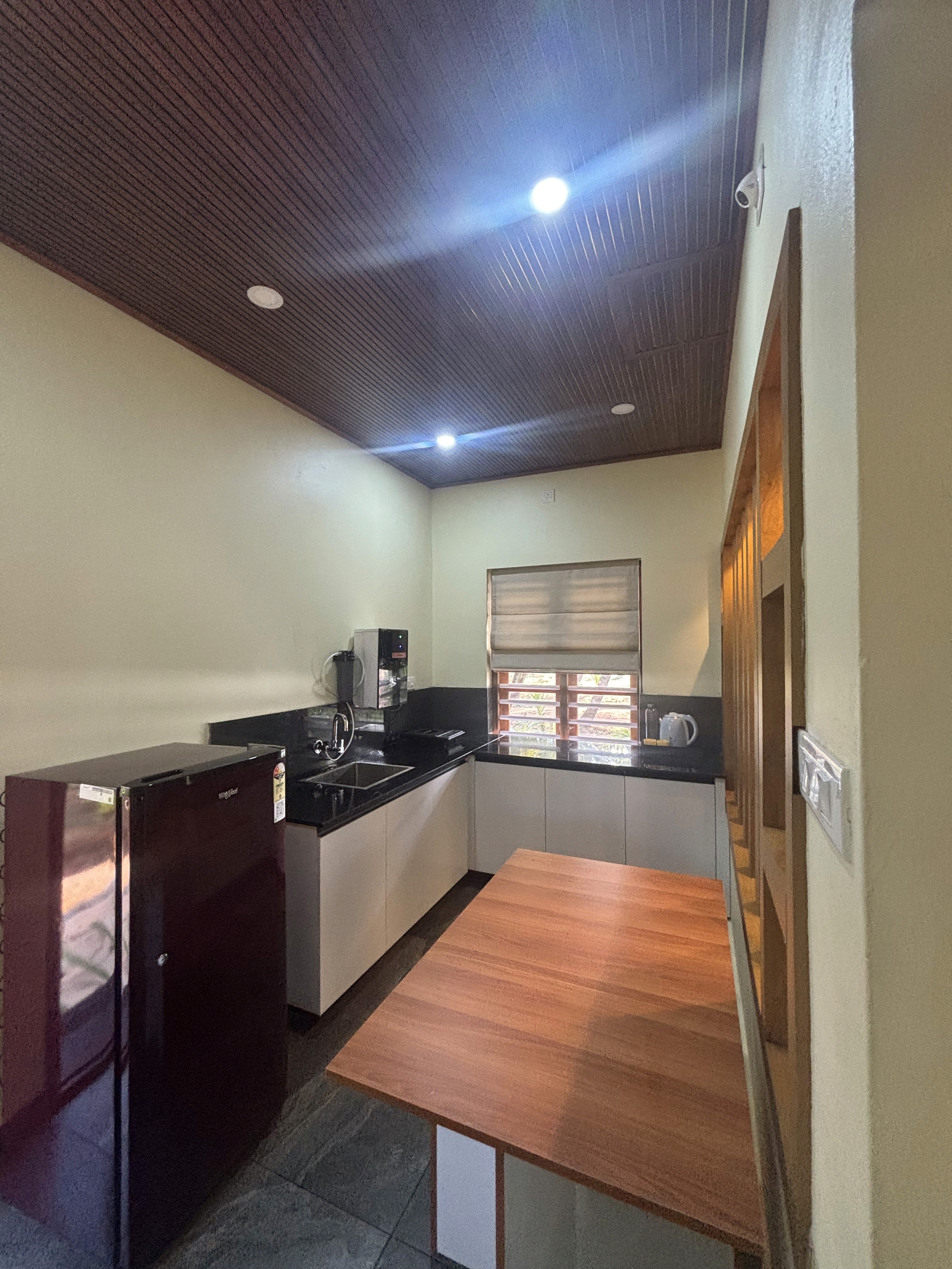 The fully functional kitchen includes a refrigerator, kettle, induction stove, water purifier, and all necessary utensils and cutlery for your convenience.